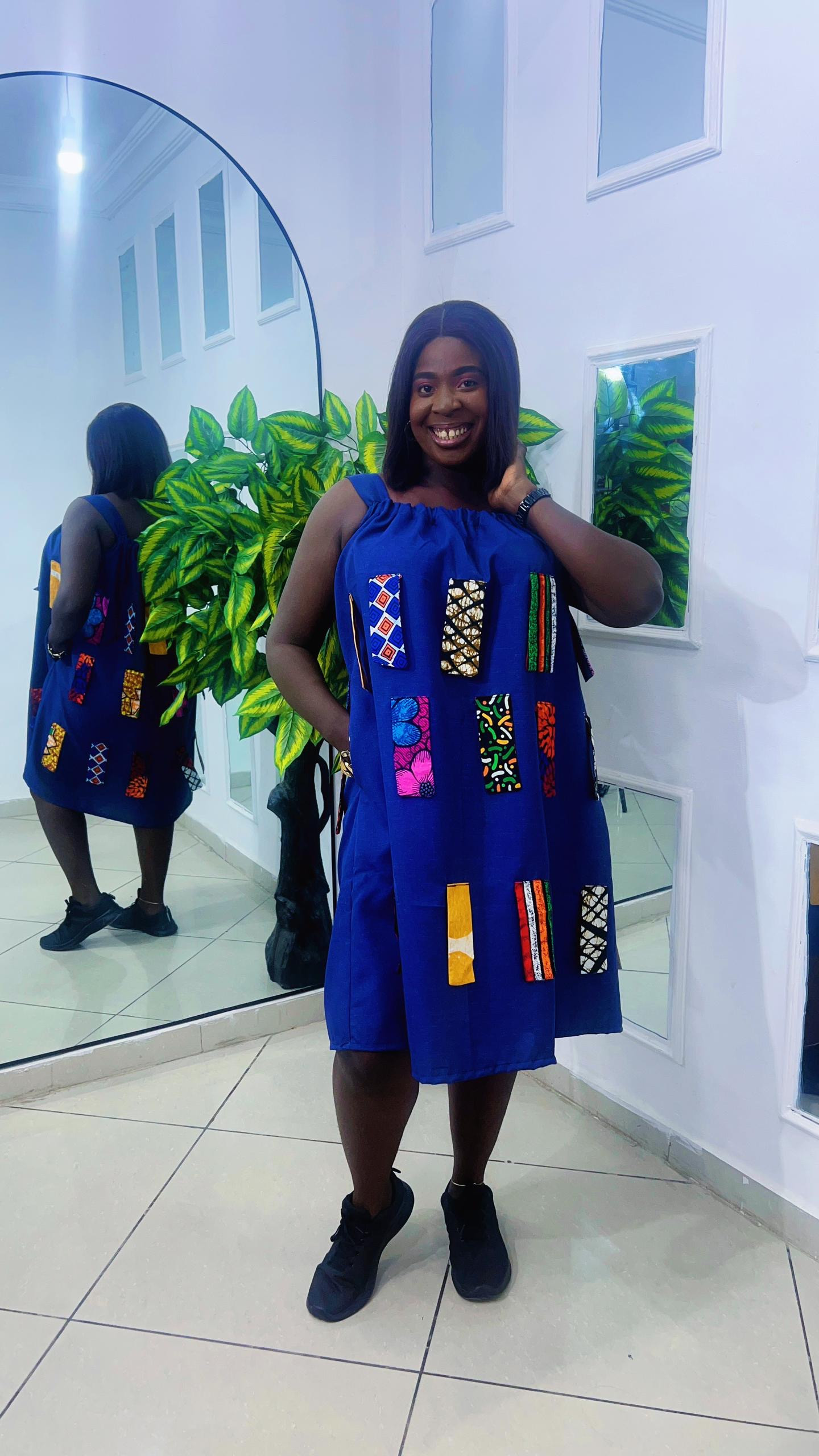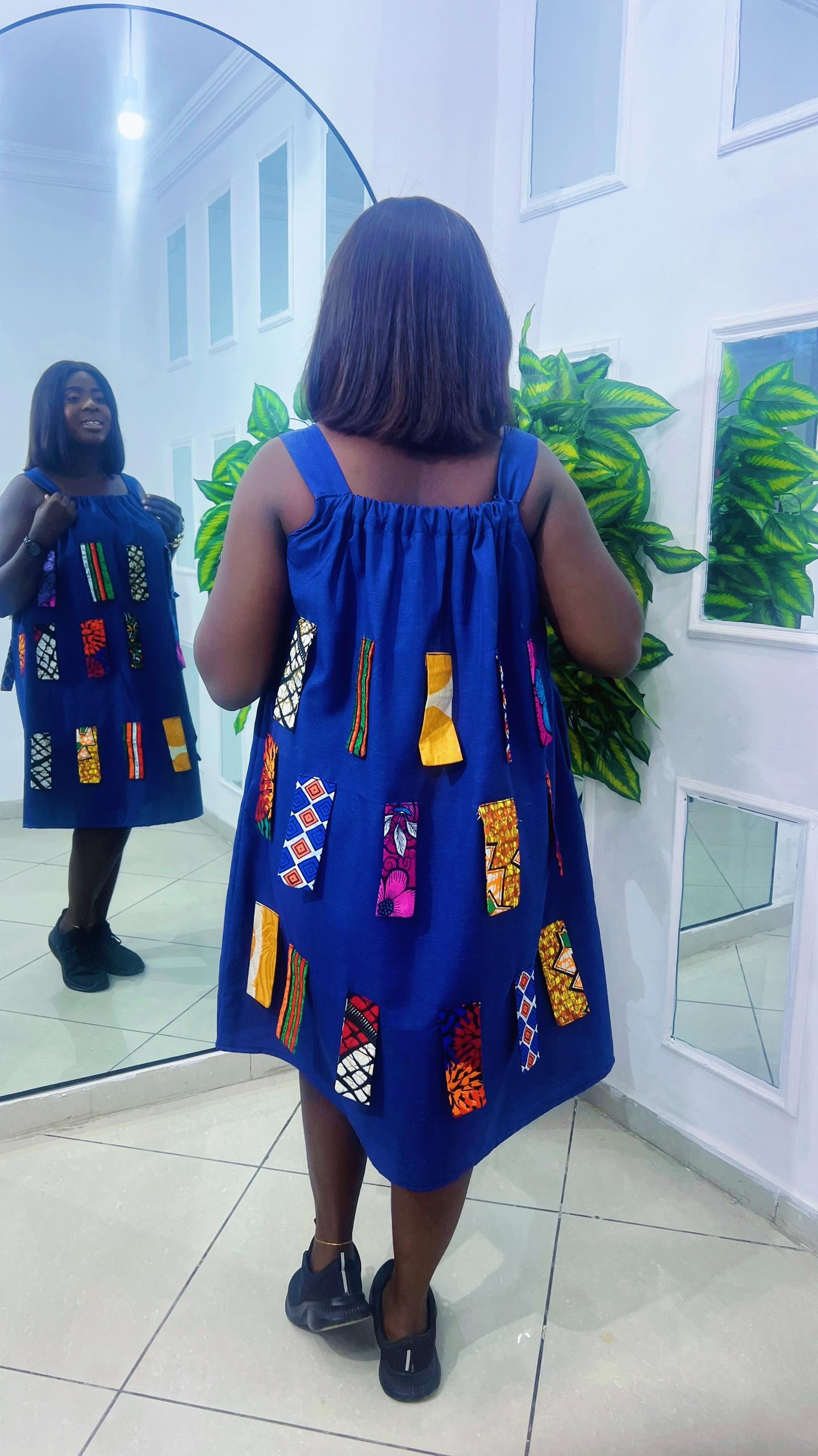A unique gown made with Denim material and Ankara patches. A dress that is suitable for the hot weather and can also serve as a "smart casual“ Turn heads in this effortlessly chic Loke Outfit.